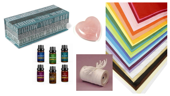 Ok. Time to pick the oils. I found a set with a variety of scents. I like to mix it up and I love the ones that feature a feeling. I’m totally the person that believes – ok if this bottle says focus, it will help me focus. I’m sure it’s, like, 90% a placebo effect. But, I don’t care. It works! Lol. I have an option for you from Amazon here to help you in your quest for oils. The set I purchased isn’t available anymore, so I found you an alternative! Finally, add a small token, like the rock I found. It could be something like a small candle or plant. Something on the theme of boho, oils, calming moments, etc. Or, a quartz healing rock! Super fun.