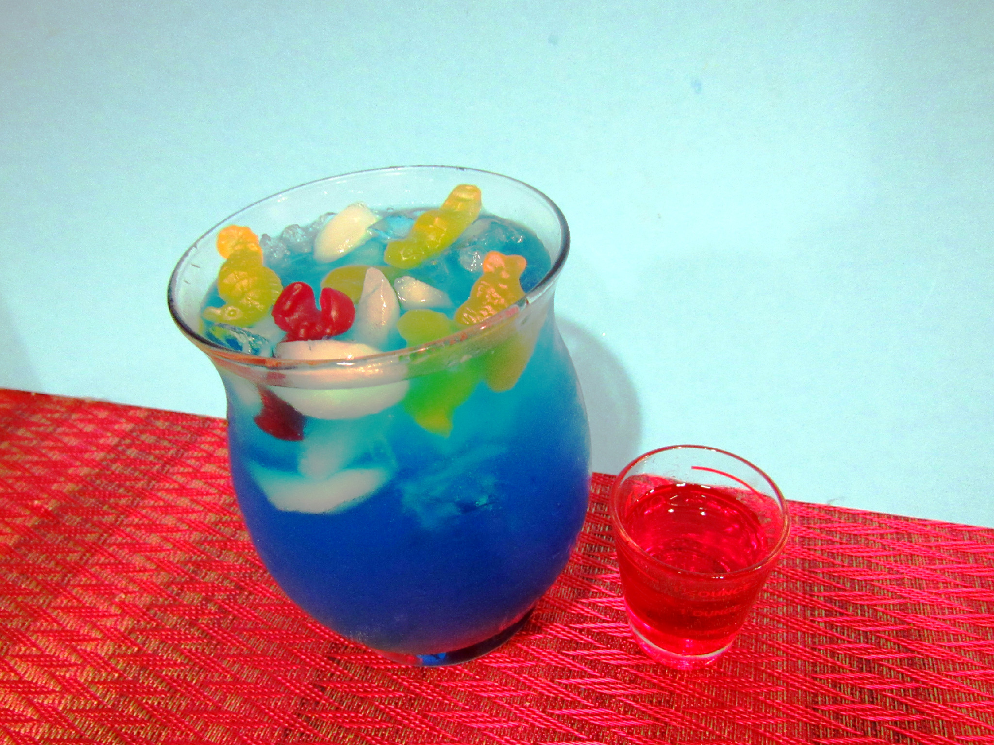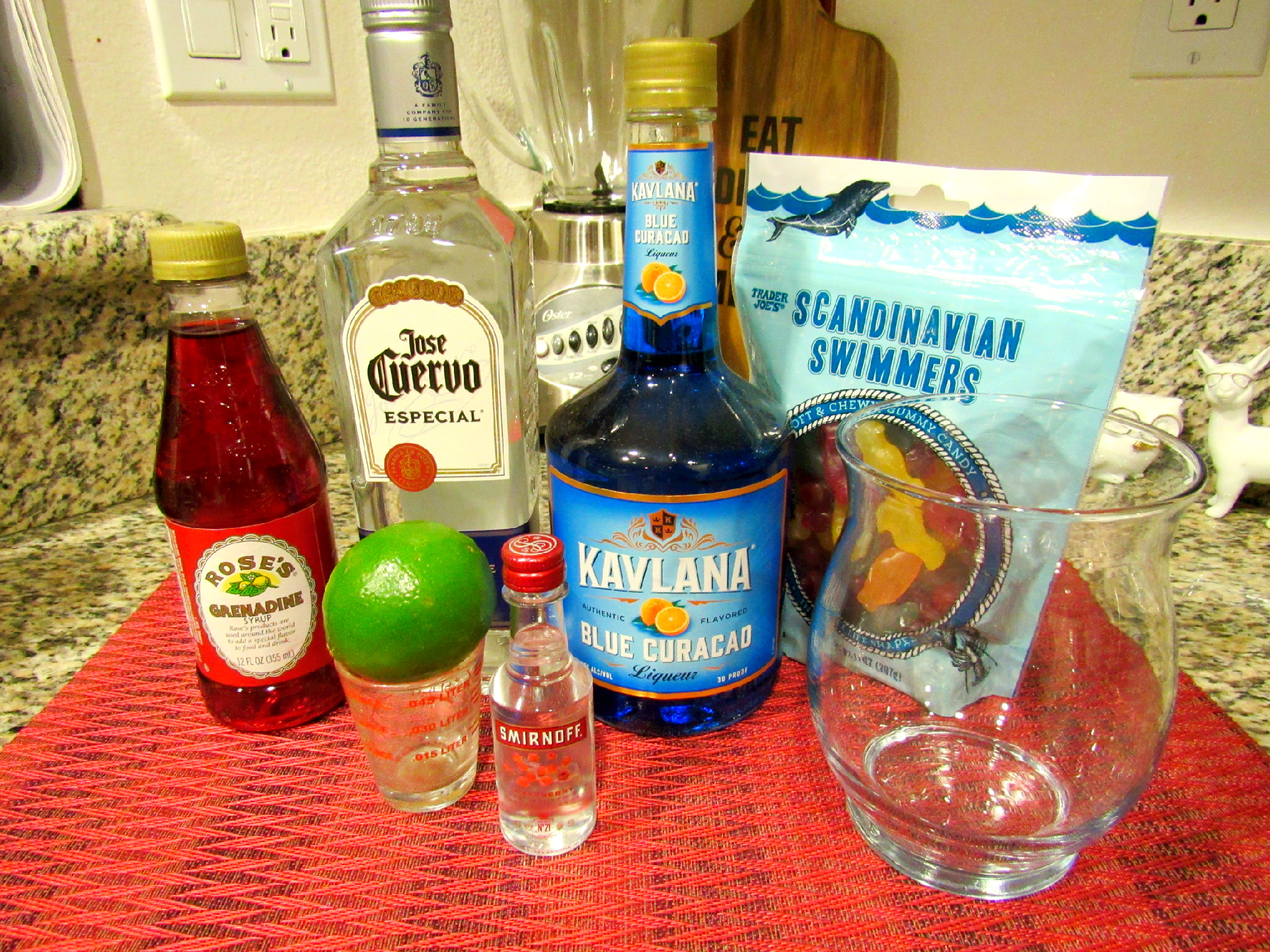 Here’s what you’ll need: glass, ice, tequila, blue curacao, Sprite, shark/fish gummies, grenadine, cherry vodka