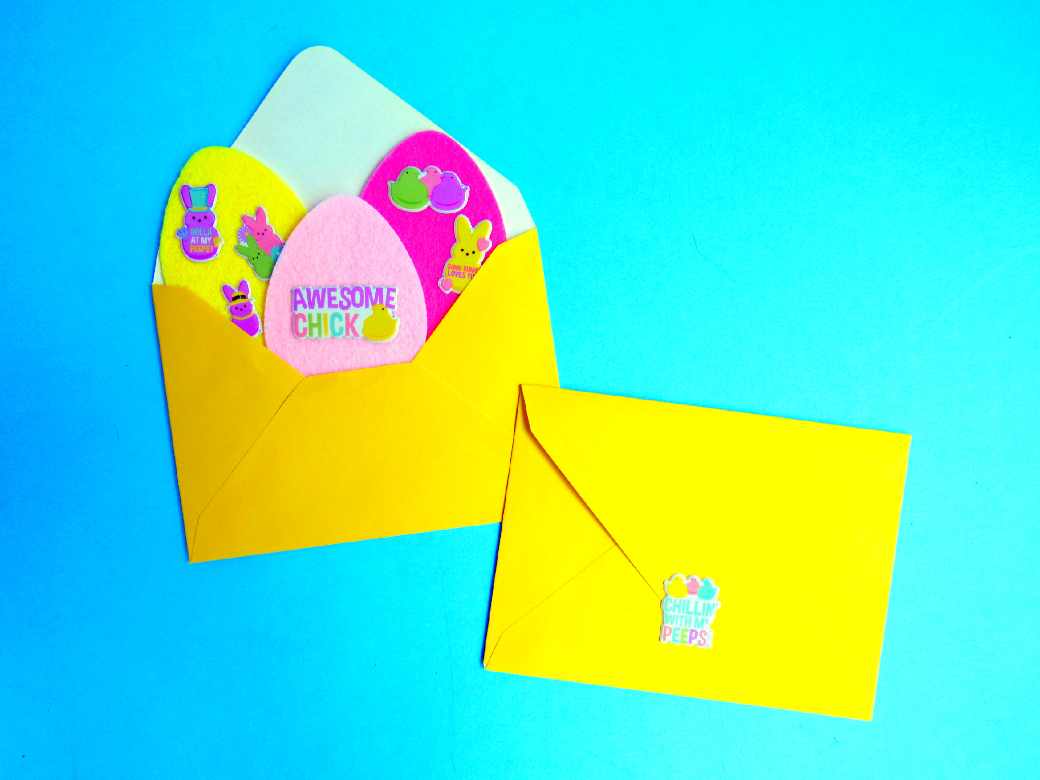 Now, maybe a basket is too big a commitment for you. I get it! We are busy, we have lives! Lol. Another idea for the freebie tags is to turn them into cards. You can print them and cut them out and send them like Valentines, but for Easter. I used the awesome sugar scented Peeps stickers to decorate the envelope. Alternatively, if printing and cutting is not your style, you could use the felt eggs and stickers too! Again, it’s all about being creative.