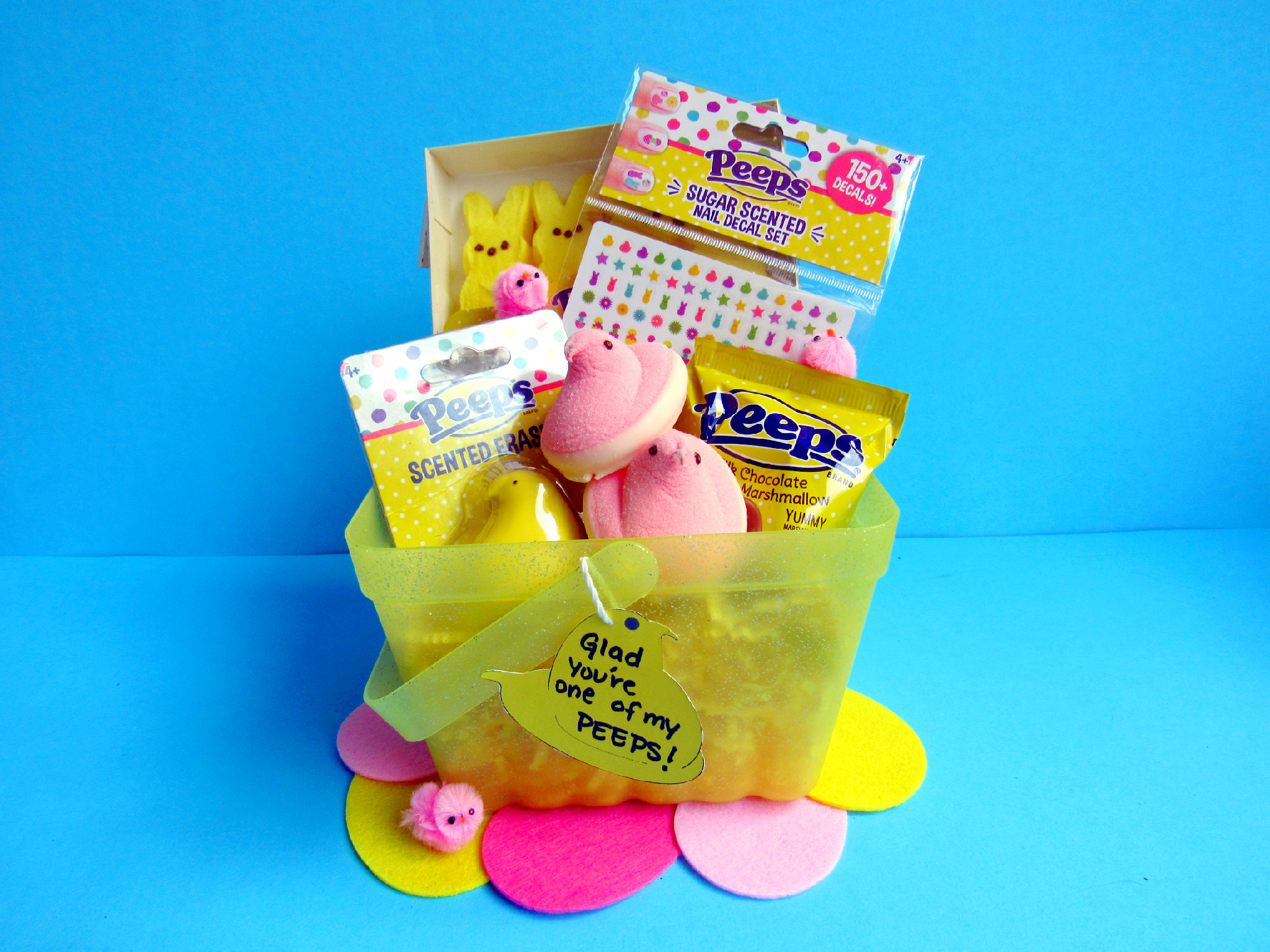 What you’ll need: yellow basket, yellow Easter Grass, scented stickers, nail decals, eraser, chocolate covered peeps, (2) yellow bunnies, felt eggs