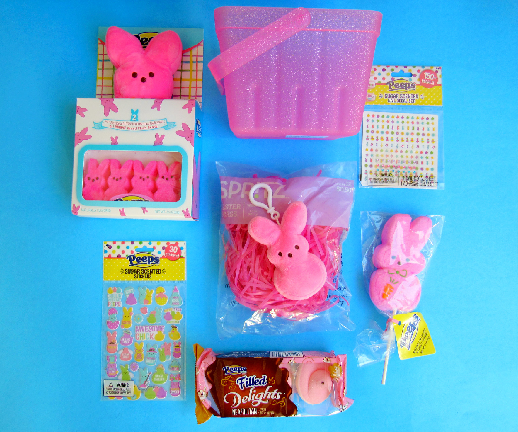 What you’ll need: pink basket, pink Easter grass, Peeps plush/candy combo, scented (YAS!) stickers, pink bunny keychain, nail decals and pink bunny pop, Neapolitan Peeps. You can find most of this at Target or on Amazon here.