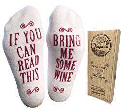 These socks are a great wine lover’s gift idea because anyone who drinks wine will agree: “if you can read this, bring me some wine”. The phrase is written across both socks in red. The socks are white. Don’t worry if you’re walking with your wine glass because these guys are non-slip! They’re super soft cotton and can wash normally. The perfect wine gift!